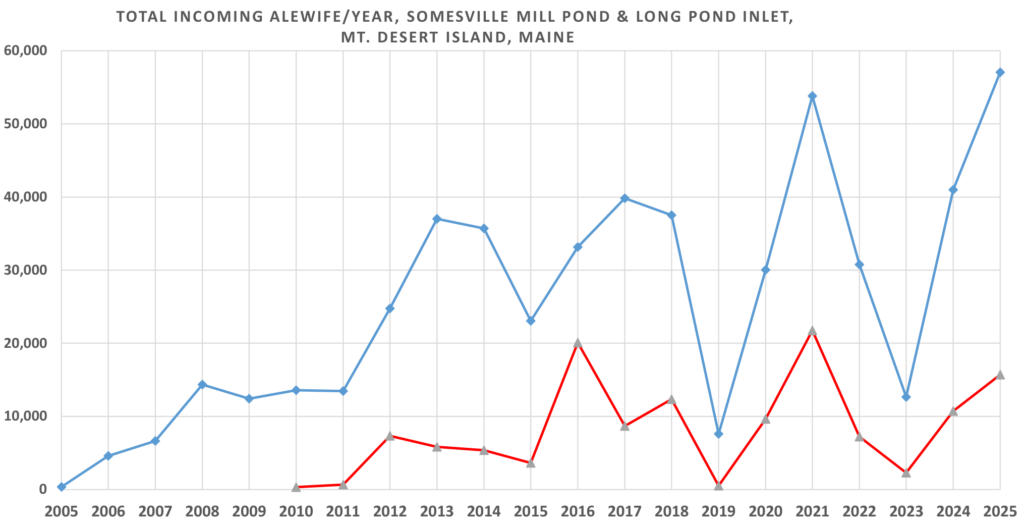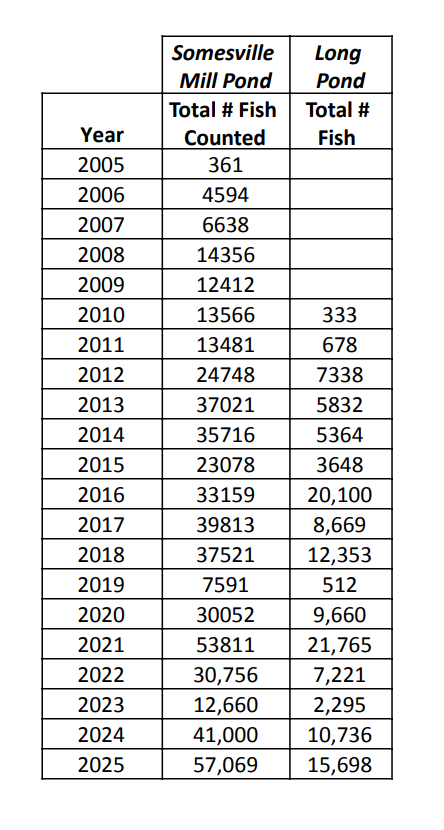 We had a multi-decade record number of adult alewife entering the Mill Pond in 2025 with 57,083 counted and 15,698 hand-netted into Long Pond. For a bigger picture of how our migration compares to others in the State of Maine and other northeastern states, visit the Shad and River Herring Data Portal managed by Manomet Conservation Science and supported by the Gulf of Maine River Herring Network, which we are a member of.